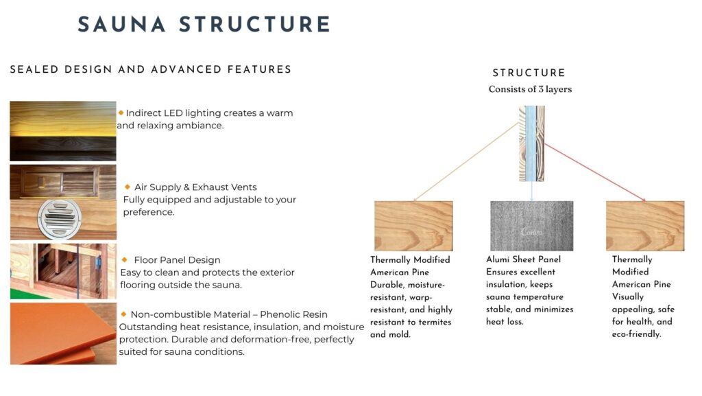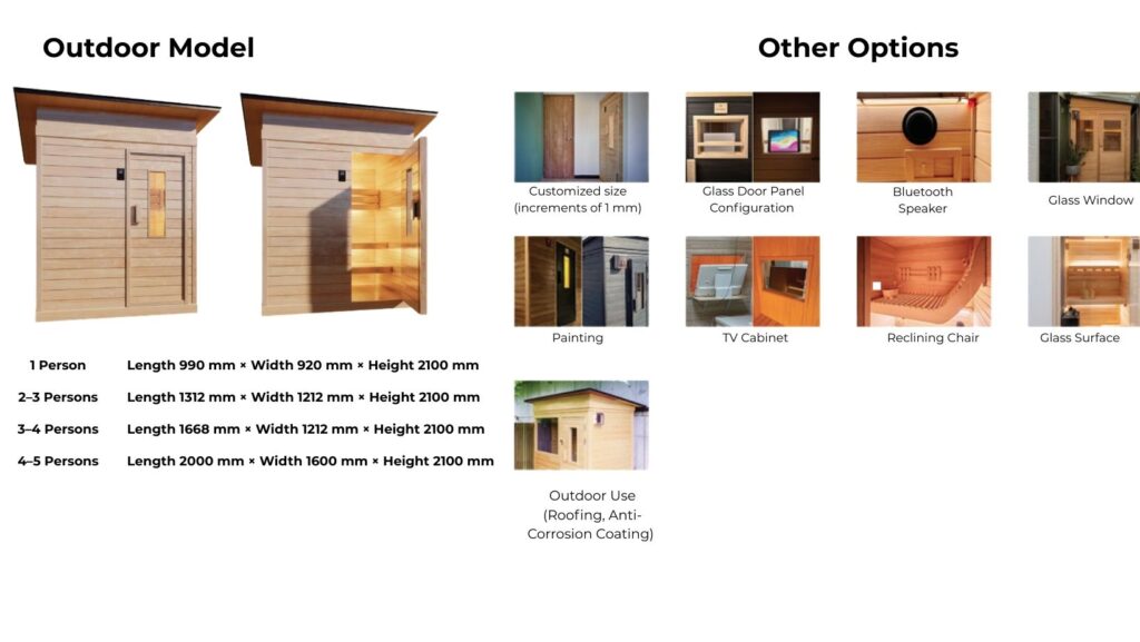 Crafted from carefully selected natural wood, our saunas are equipped with a safe, energy-efficient operating system and certified with the PSE technical standard. More than just a health care device, it is also a perfect solution for creating a luxurious living space and private relaxation.